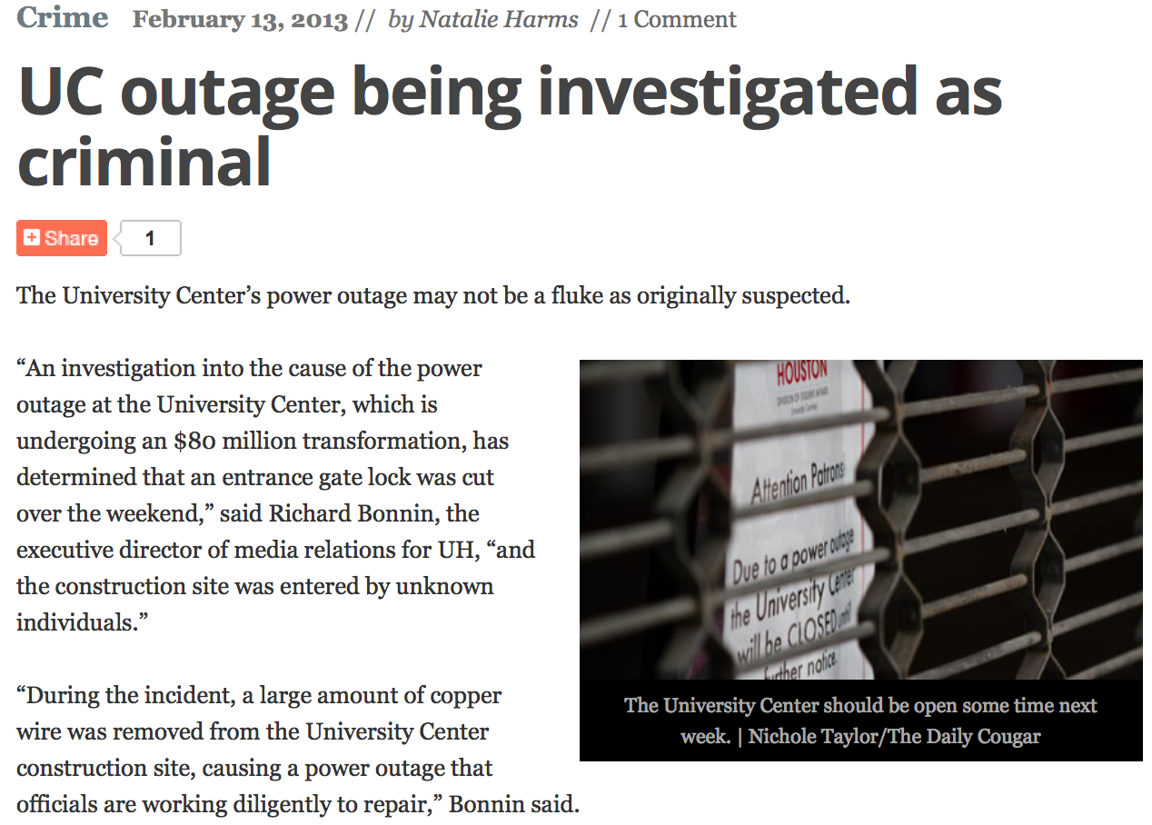 Click here to view the full story: UC outage being investigated as criminal – The Daily Cougar