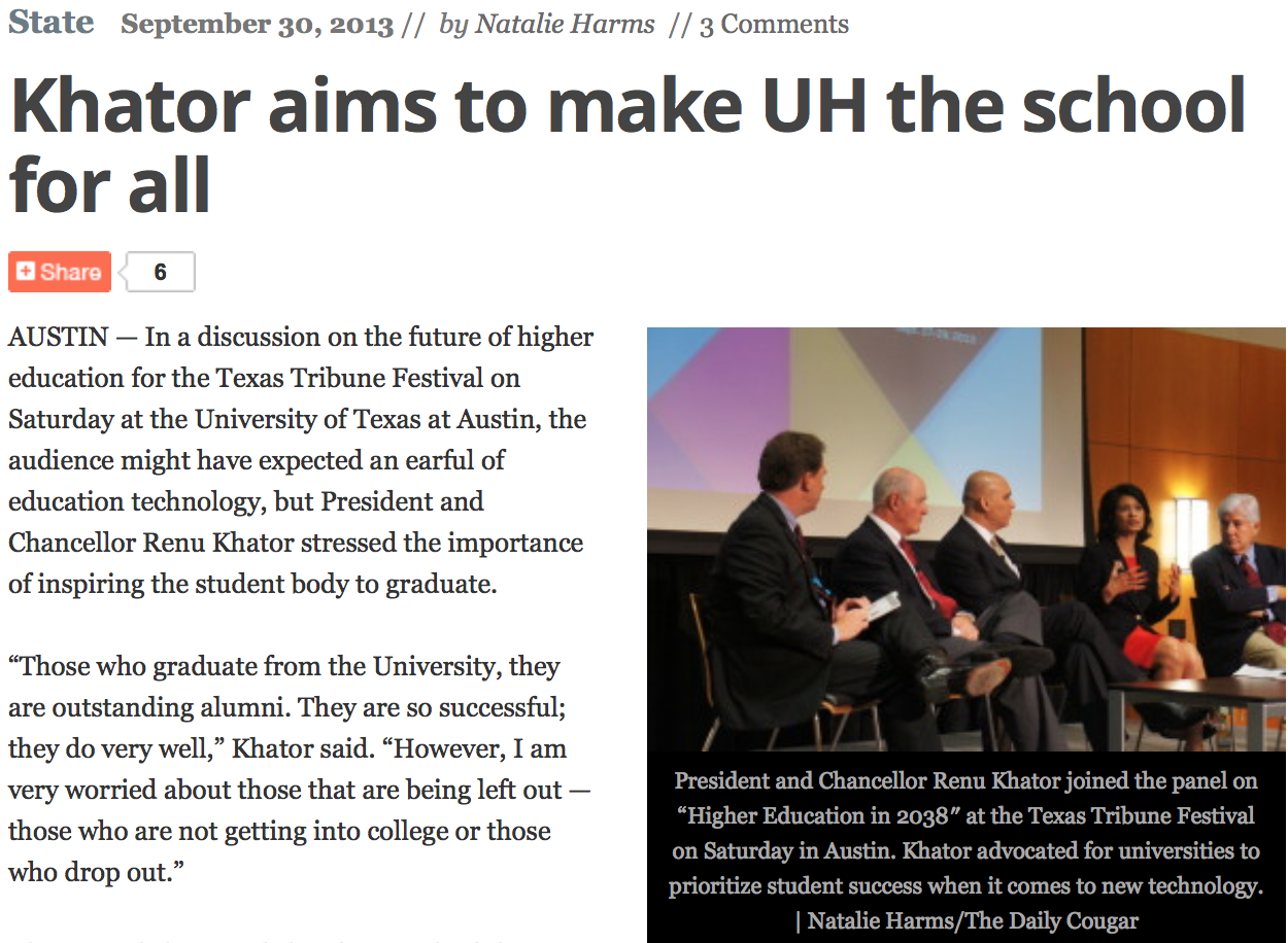 Click here to view the full story: Khator aims to make UH the school for all – The Daily Cougar